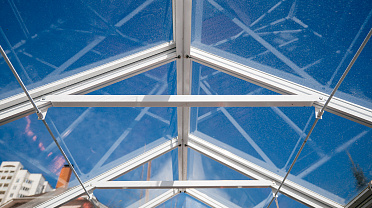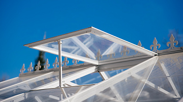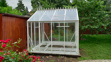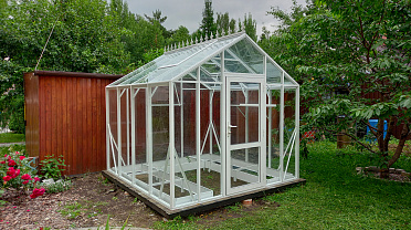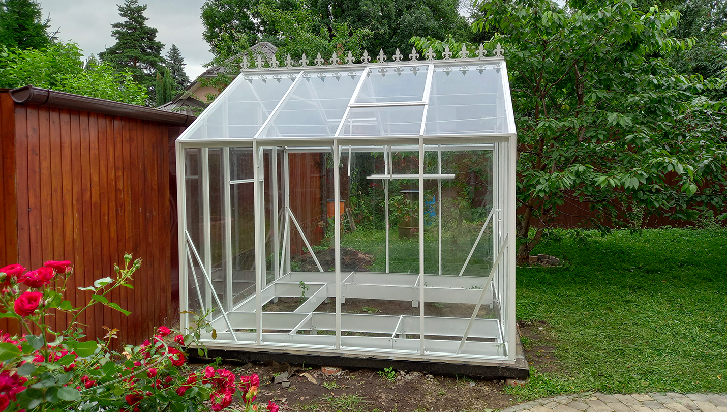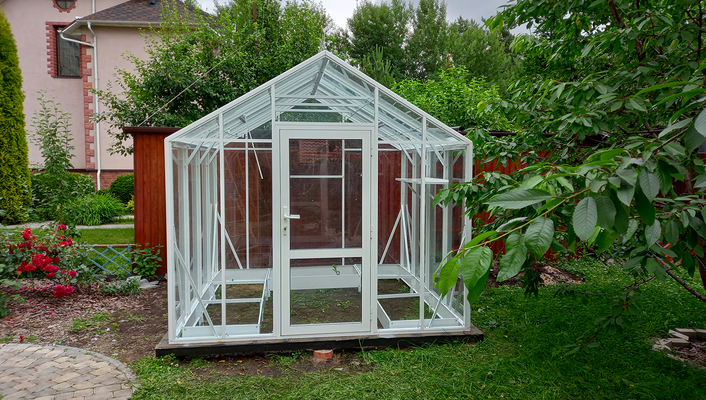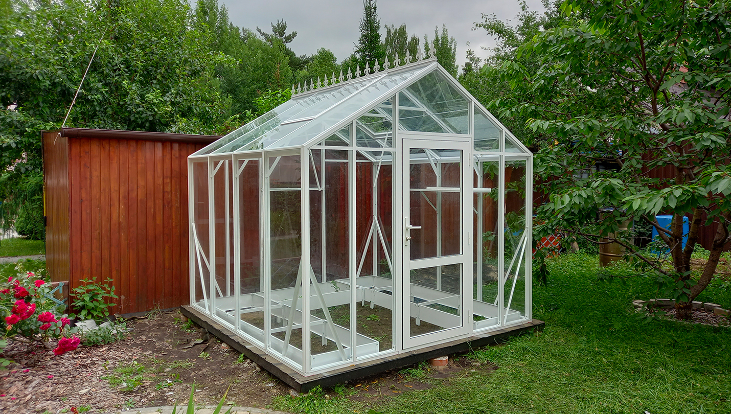 Теплица сохраняет выразительность и функциональность в любое время года. Летом она становится лёгким и открытым пространством, а зимой подчёркивает архитектуру участка, оставаясь надёжной и устойчивой в условиях снеговых нагрузок.